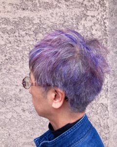 元々の白髪・黒髪を残しながらパープル・ゴールド・ブルーカラーをバランスよくオン。